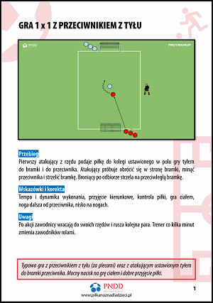 Jeszcze jedna przykładowa strona. Część praktyczna, czyli ŚRODKI TRENINGOWE. Przykładowa gra 1 x 1 (w tym przypadku z przeciwnikiem z tyłu). Bardzo prosta gra, ale można zwrócić uwagę na wiele DETALI – ruch bez piłki, przyjęcie piłki, grę ciałem, obrócenie się w stronę bramki, skuteczne zwody bez piłki i z piłką.
