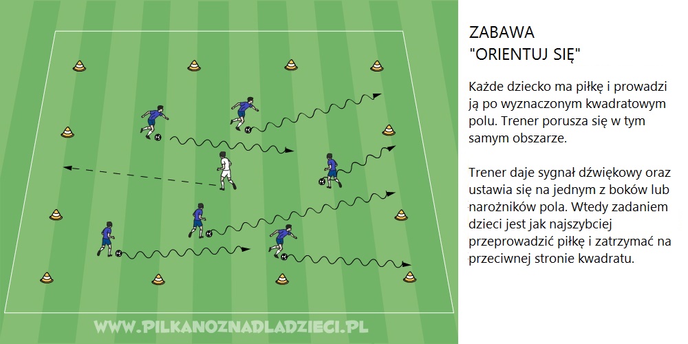 Dzieci prowadzą piłkę w dowolny sposób, starają się trzymać głowę w górze i rozglądać po boisku tak, by widzieć trenera. Trener porusza się mniej więcej po środku pola. Określ sygnał, po którym podbiegasz do jednego z boków lub narożników pola, może to być klaśnięcie, gwizdek, “hop”, czy tytułowe “orientuj się”. Wtedy dzieci muszą przeprowadzić i zatrzymać piłkę na drugiej, przeciwległej stronę pola. Oczywiście muszą zrobić to jak najszybciej.