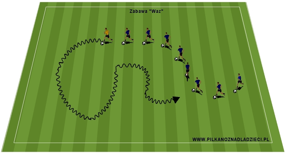 Przebieg: Trener prowadzi “węża” idzie pierwszy na czele, a za nim podążają wszystkie dzieci prowadząc piłkę w dowolny lub wskazany przez trenera sposób, tak by utworzyć jak największego węża. Trener oczywiście idzie slalomem jak pełzający wąż. Bardzo prosta zabawa na prowadzenie piłki i przydatna na przykład do zorganizowania zbiórki na linii lub w kole podczas zajęć. Przy młodszych grupach oczywiście wąż pełza powoli i spokojnie, przy starszych trener może przyspieszyć i robić więcej zmian kierunku utrudniając zadanie.