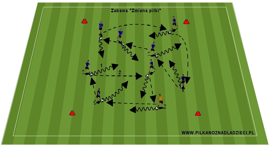 Przebieg: Dzieci prowadzą piłkę w dowolny sposób na wyznaczonym polu. Na sygnał trenera zatrzymują piłkę, po czym jak najszybciej biegną do innej wolnej piłki. Każdy zawodnik musi zmienić piłkę. Możemy urozmaicić zabawę poprzez określenie sposobu zatrzymania piłki, poruszania się lub dodać jakieś ćwiczenie z piłką, które trzeba wykonać po zmianie (np. zwód).
